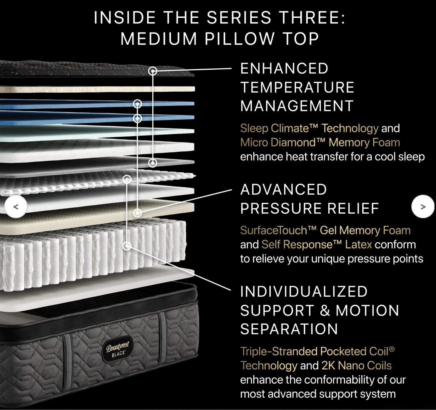 Experience the best of Beautyrest® Black Series Three Medium Pillow Top Mattress, featuring advanced temperature management technology, Micro Diamond™ Memory Foam, and advanced, Triple-Stranded Pocketed Coil® Technology for conforming support and motion separation. Self-Response™ Latex offers a specialized upgrade for responsive pressure relief, as it contours to relieve your body’s unique pressure points while maximizing airflow for cool sleep every night. Plus, for an even more luxurious upgrade, Series Three Pillow Top models feature exclusive 2K Nano Coils for enhanced, individualized support throughout the night. With the inclusion of premier materials and advanced sleep technology, the Beautyrest Black® Collection optimally aligns at the intersection of luxury and innovation for an extraordinarily comfortable sleep.