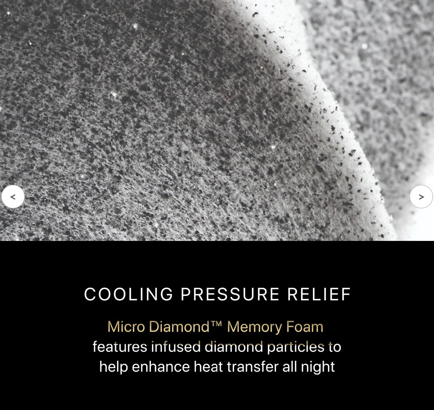- A premium memory foam, infused with diamond particles, is designed to help move heat away from the body for a cool sleep.