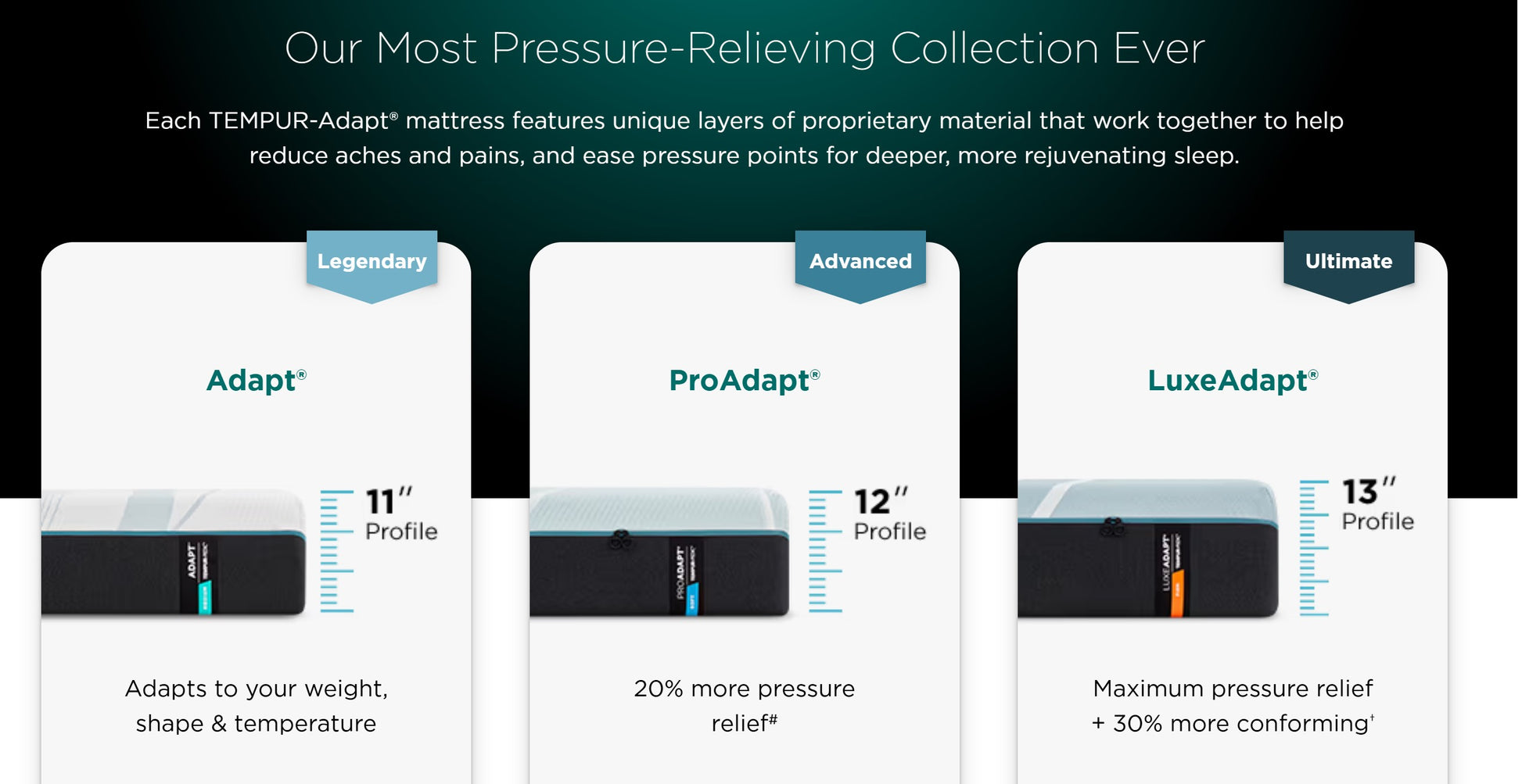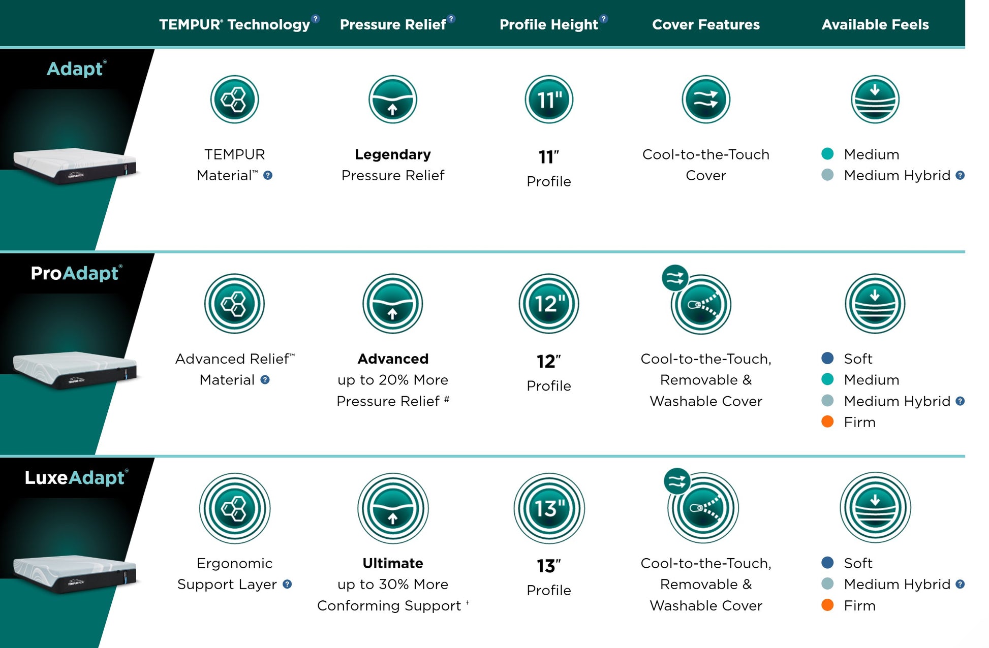 Experience ultimate pressure relief with ergonomic support for the sleep you need on the TEMPUR-LuxeAdapt® Medium Hybrid Mattress. The layer of adaptable TEMPUR-Material™ supplies exceptional pressure relief to help reduce aches and pain while providing superior motion absorption for nights of undisturbed rest. This ventilated material also delivers extra airflow and breathability. Additional layers of Advance Relief® material adapt to your body's unique shape for advanced pressure relief.